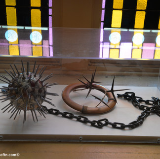 The upstairs balcony has a fabulous view of the Sanctuary below, and its seating are chairs from an old Opera house that include wire fixtures under the seats for top hats! From here you have a superb view of the ceiling tiles that are meant to convey the skies in Egypt, and a close-up view of more stencils and stained-glass windows. Interesting notes: The stairs leading to the balcony are covered in leather, and the rope to ring the church bell is located here.