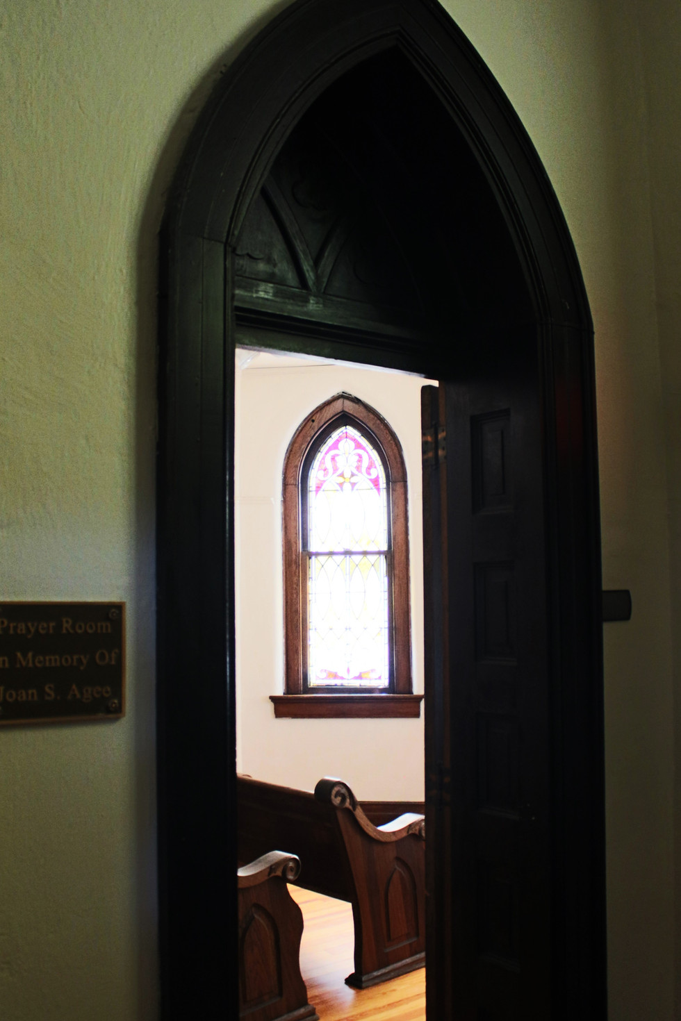 The architectural details are so worth exploring. The balustrades, pew configurations, upper balconies and pulpit stage are gently curved and enveloping. Inside and outside, the arches of the windows and doors are clear nods to its Gothic Revival style inspiration, but often have softened lines that make the look less severe. The artists who created the stained-glass windows were clearly among the best in their field (most likely Tiffany or someone inspired by their work). The colors of the glass are vibrant yet soothing, and visible in every part of the spacious room. I find the design of the church to be like a warm embrace: so pleasing to the eye in every way in its beauty and softness.
